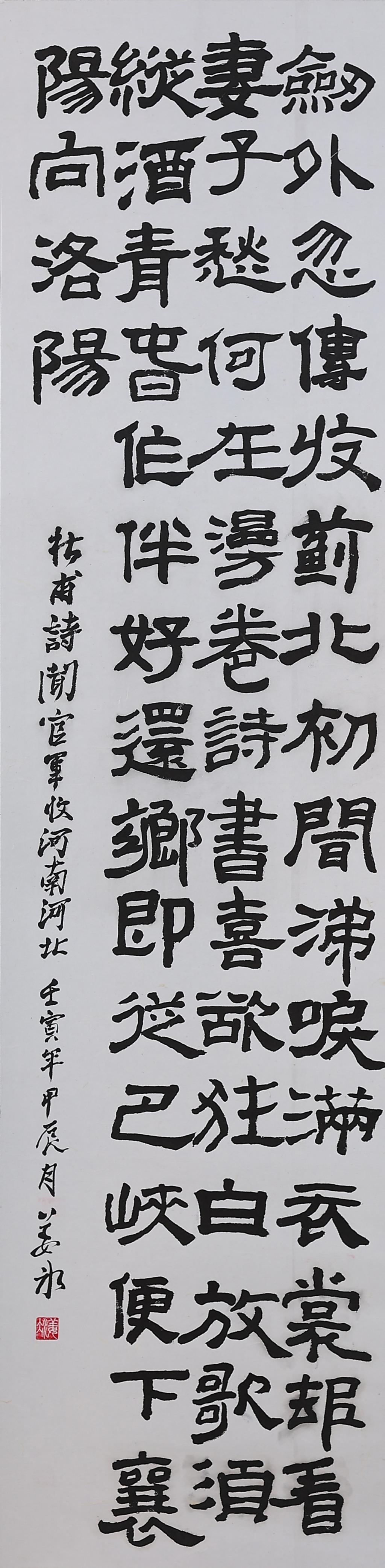 The calligraphy is regular script. The contents are, in order, "Guest Arrival" by the Tang Dynasty realist poet Du Fu, "Autumn Evening" by the outstanding Tang Dynasty poet Du Mu, and Du Fu's poem " Relaxation at the Water Threshold (Part 1)".