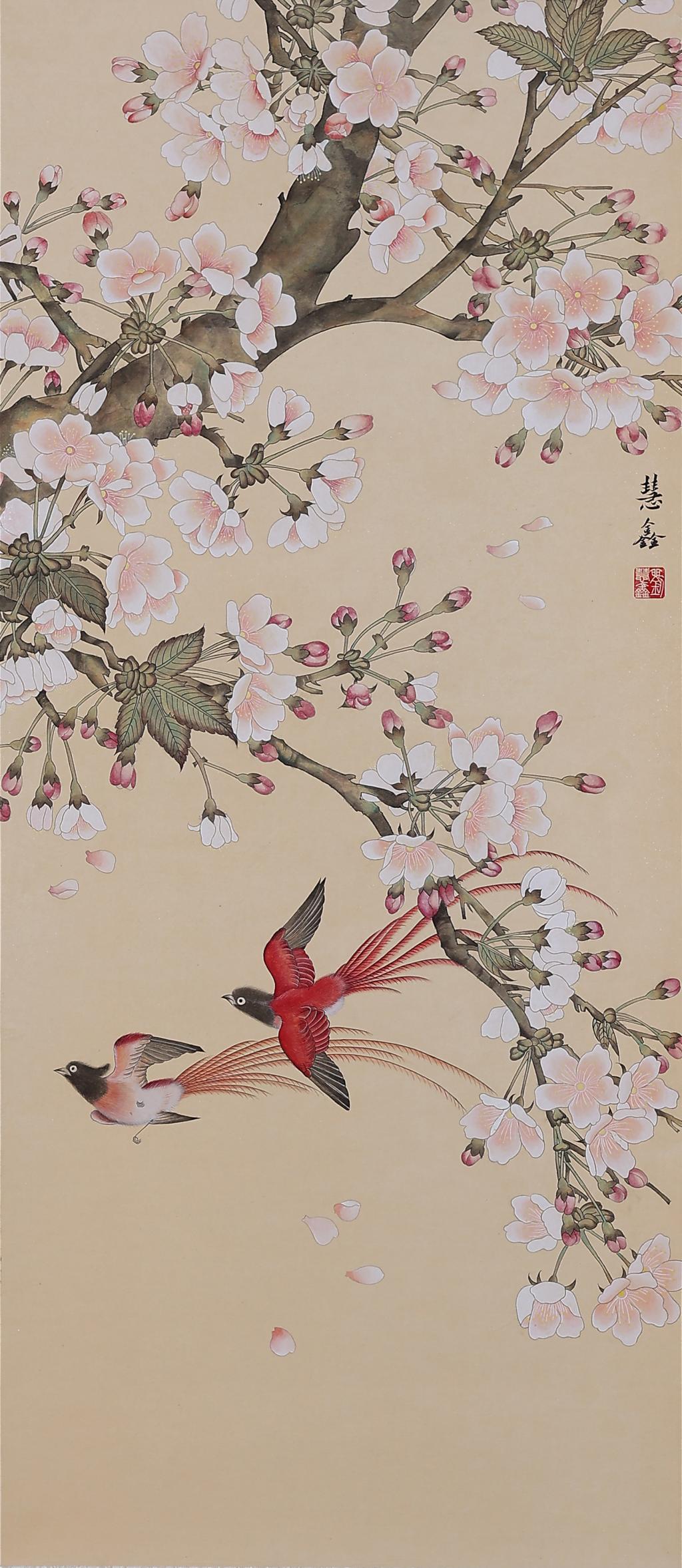 Flowers and birds are the traditional theme of Chinese painting, which I use for creation, blending flowers and birds into the picture harmoniously. In terms of color matching, I also choose the traditional cinnabar, garcinia and three greens, making the picture simple, natural and serene.