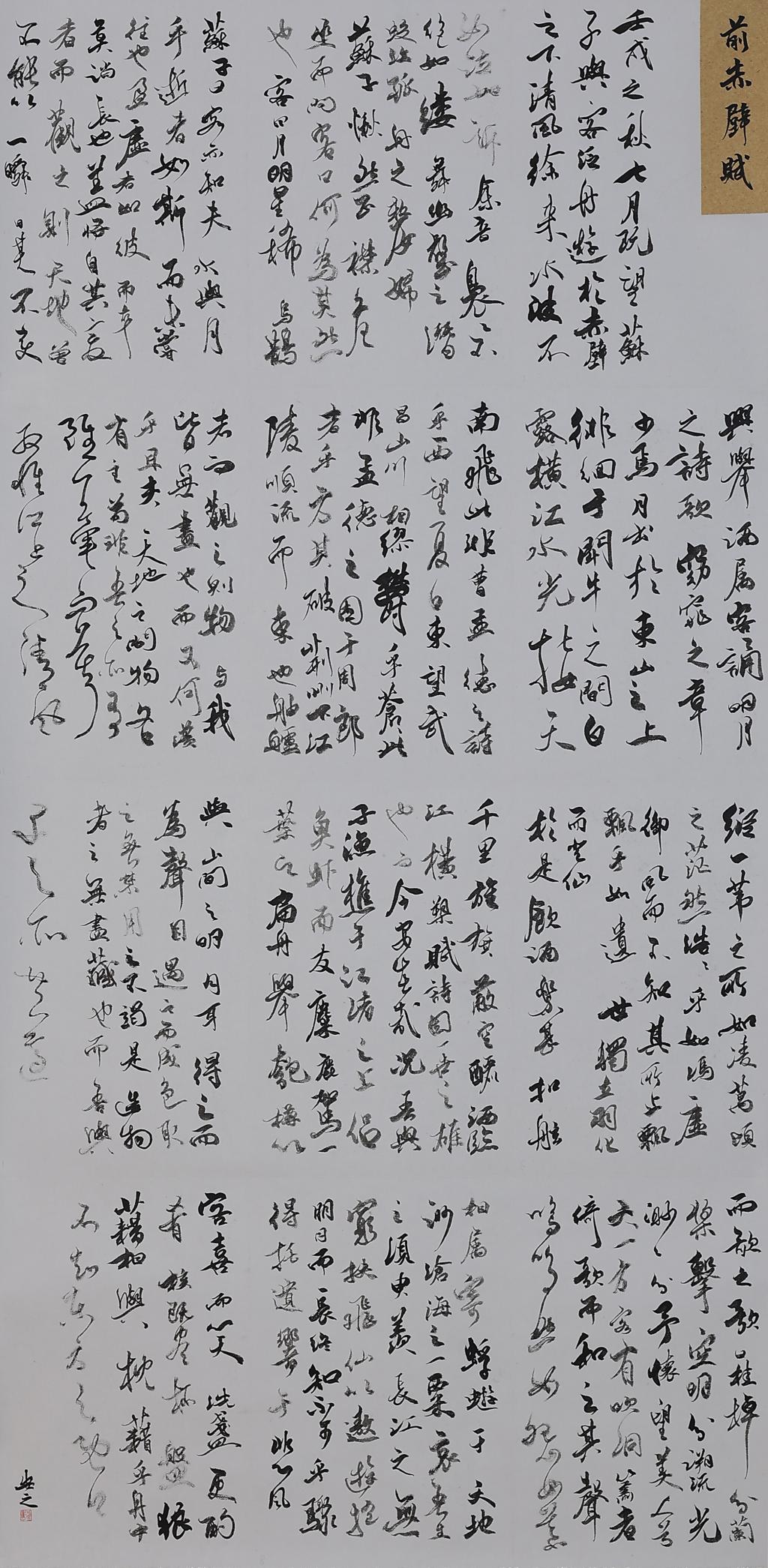 The whole piece is a twelve-piece miniature of Su Shi’s “The First Ode for the Red Cliff” in Mi Fu’s cursive style. The fugue recounts what the author and his friends saw and felt during a boat trip to the Red Cliff. Taking the author’s subjective feelings as a clue and by the question-and-answer format, it reflects the author’s relaxation boating in the moonlit night his sorrowful sorrow for the past and the present, and his spiritual liberation.