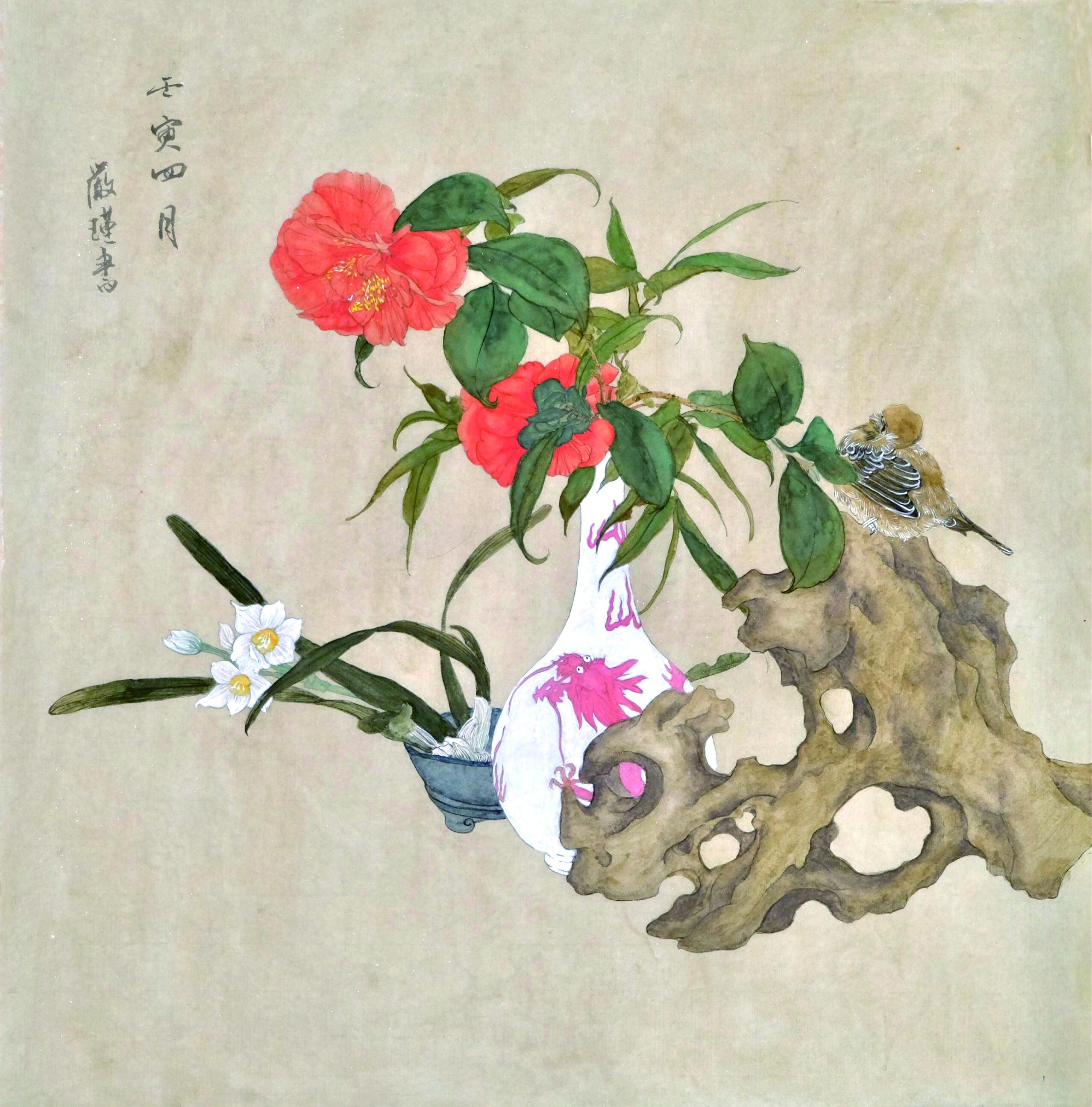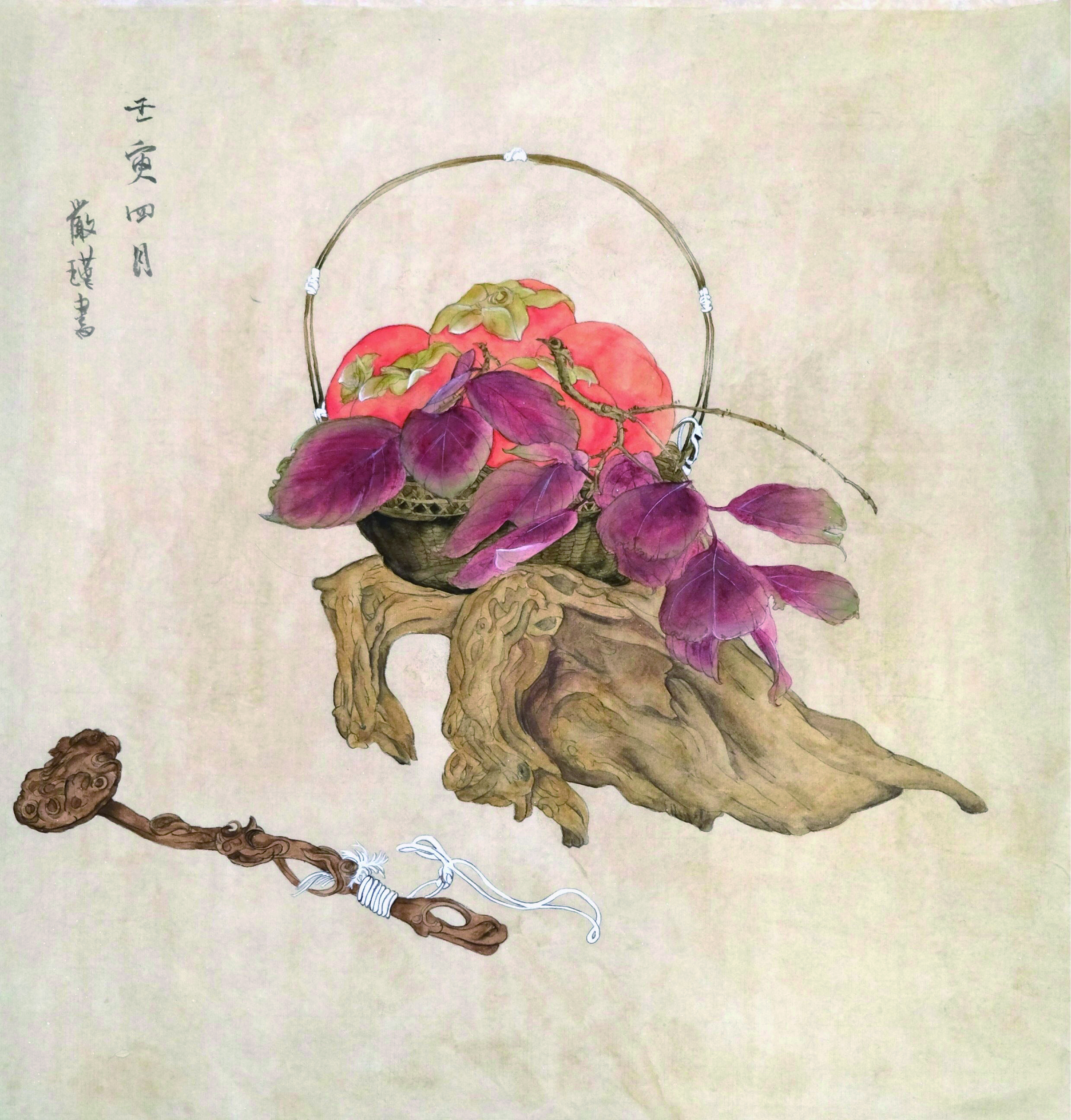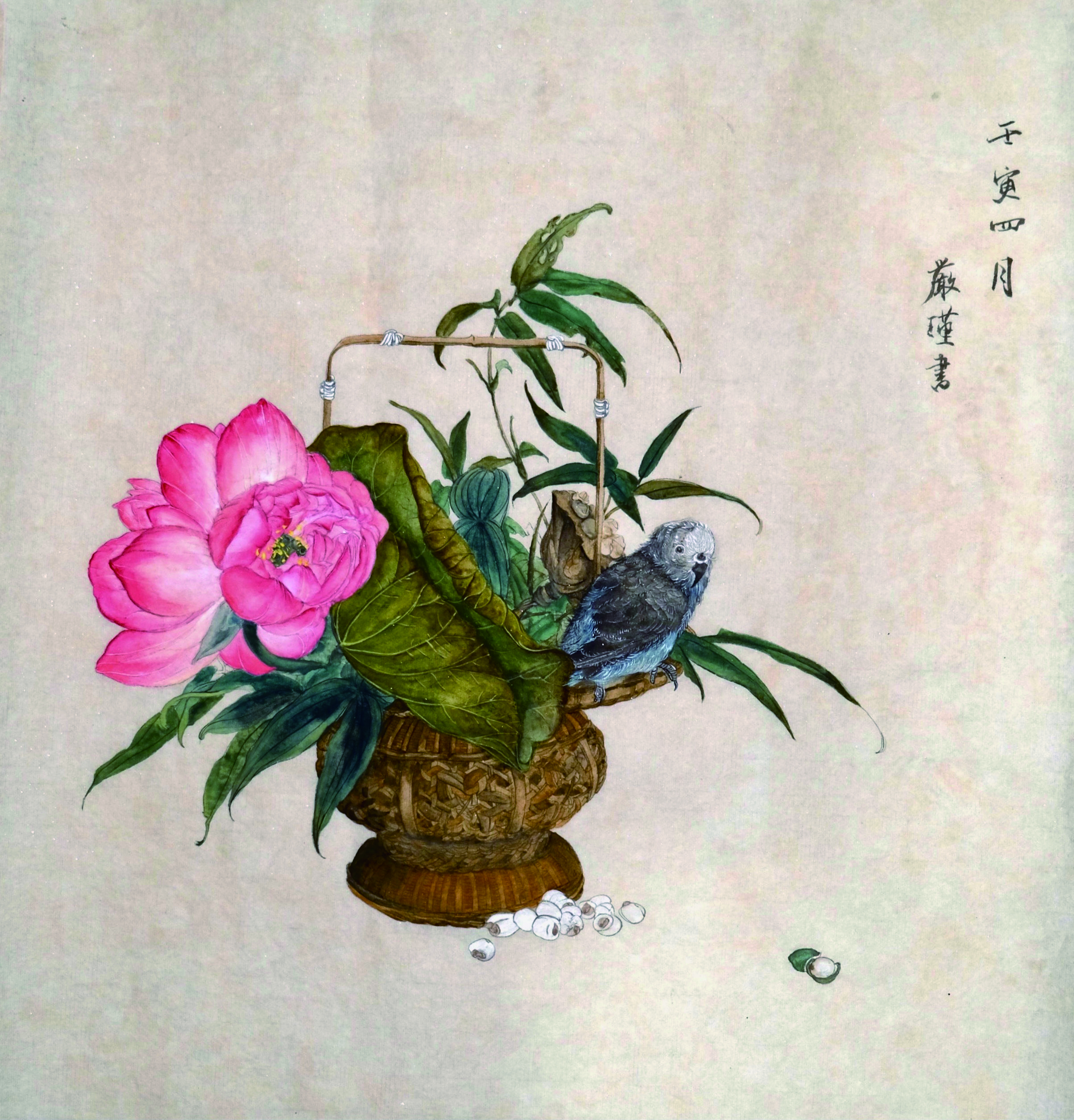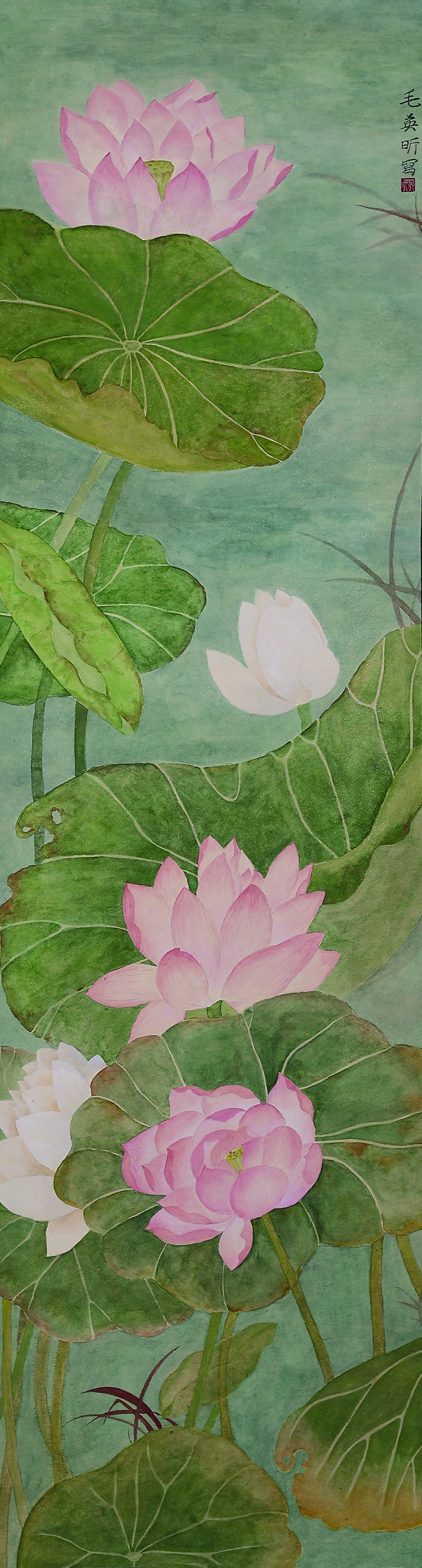 The work was inspired by the summer lotus with reference to the brushwork of Song Dynasty. It uses shading, highlighting and other methods to sketch lotus leaves, and is slightly different from the traditional fine brush painting
