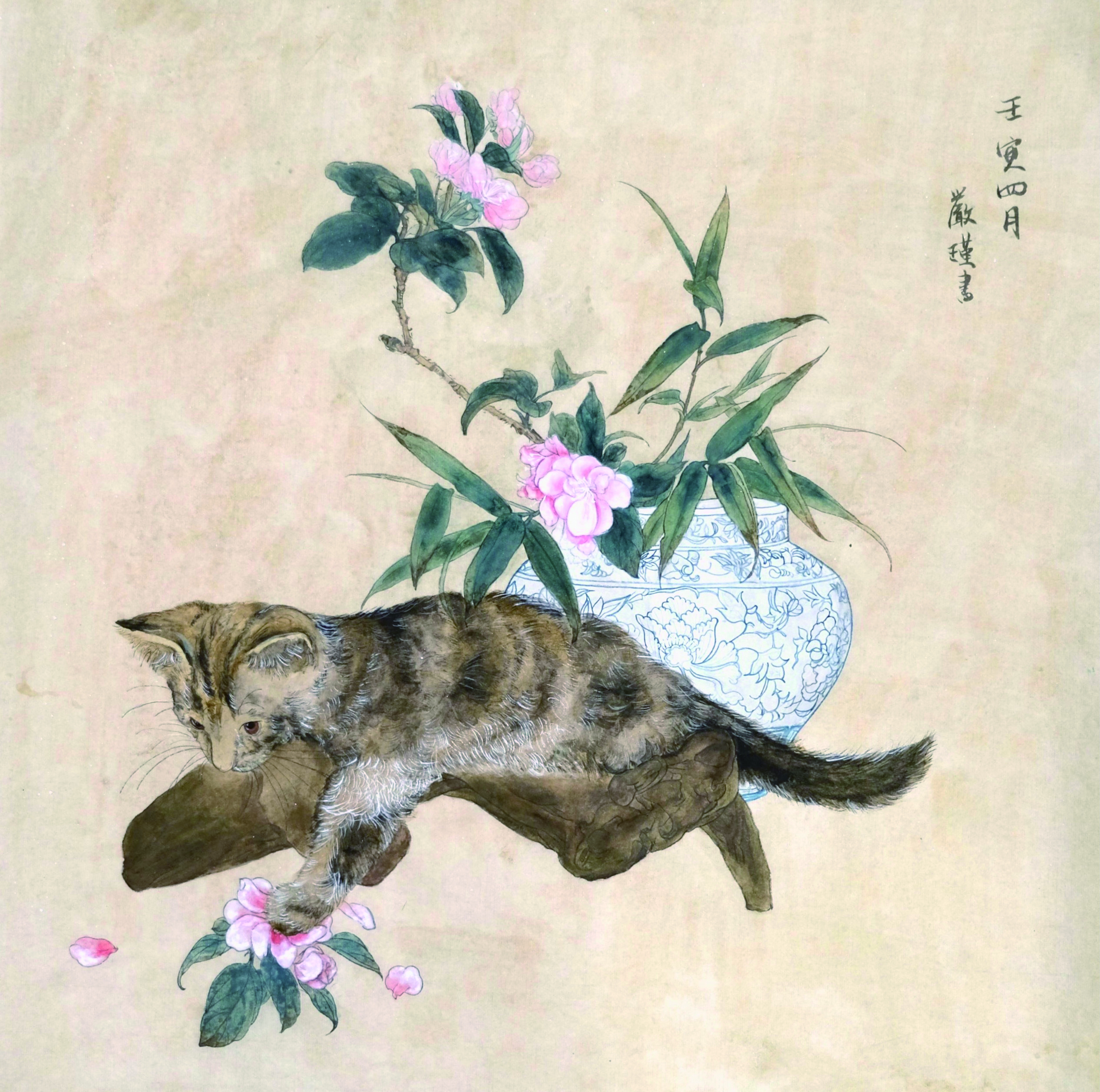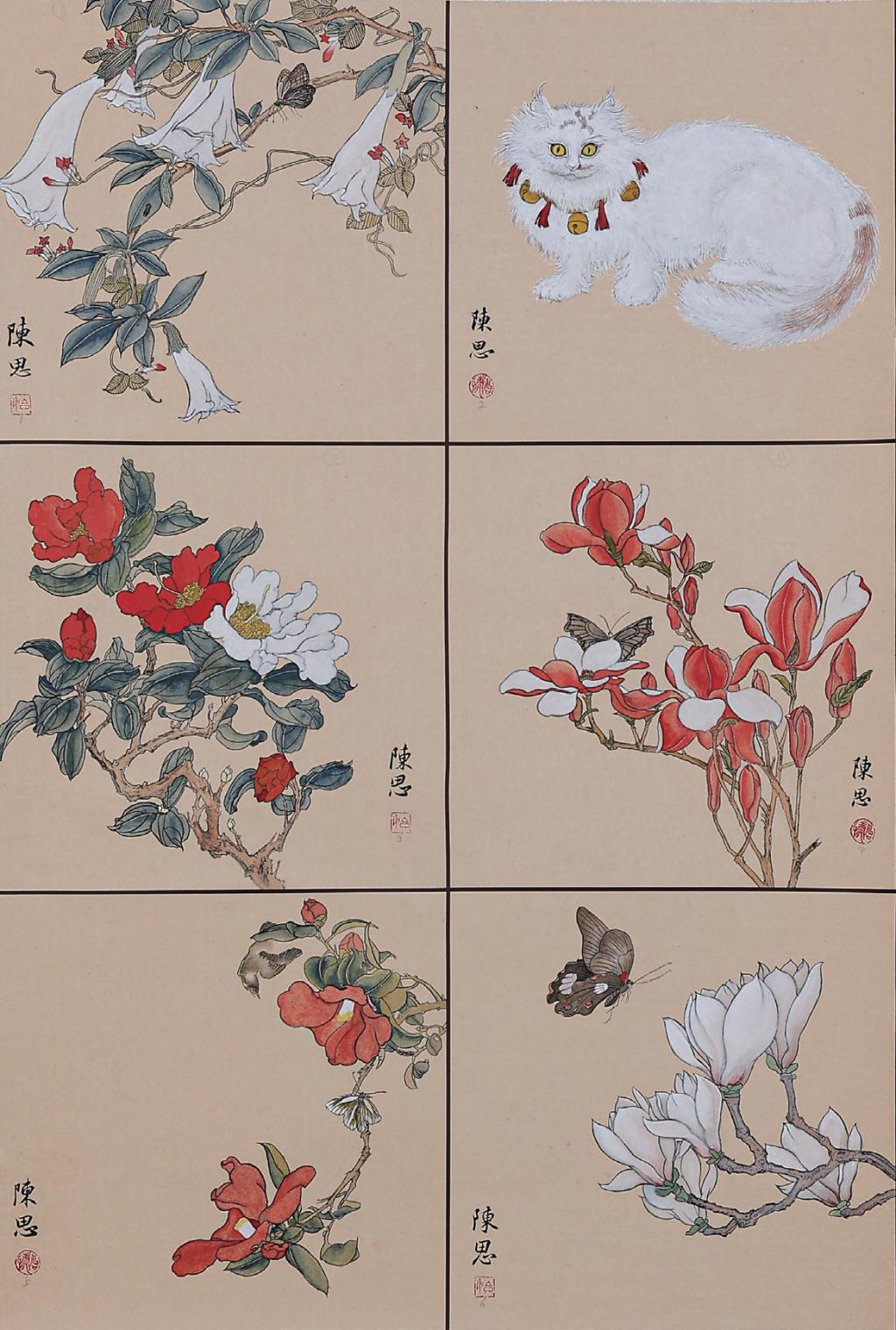 仿元人山水笔意,整幅为 6 块小品。作品采用传统披麻皴的笔法,间用水色,先皴后染,用墨色分山石结构、青色和浅绛丰富肌理,意在古朴稚拙中表现晕染变化之能势,在意境清幽中营造秀美灵动之神。