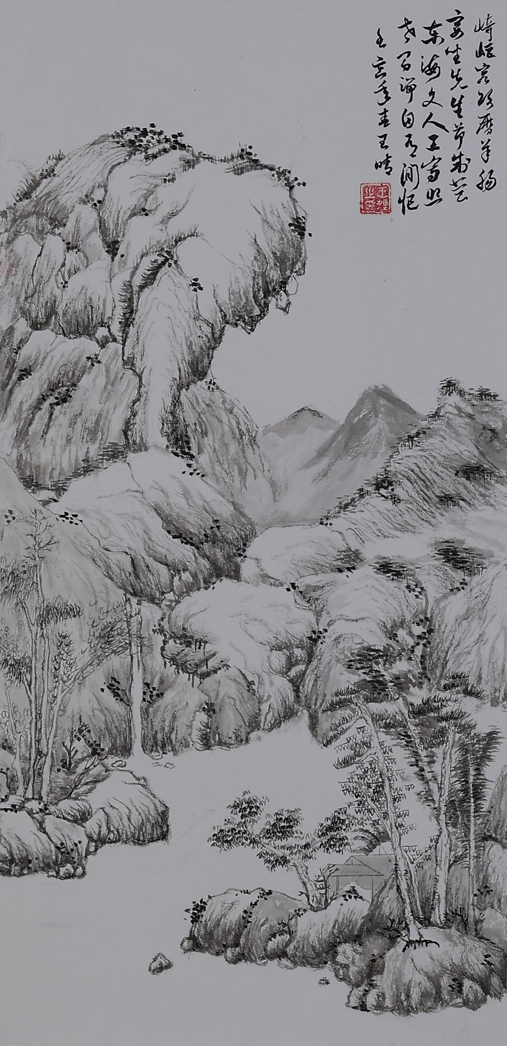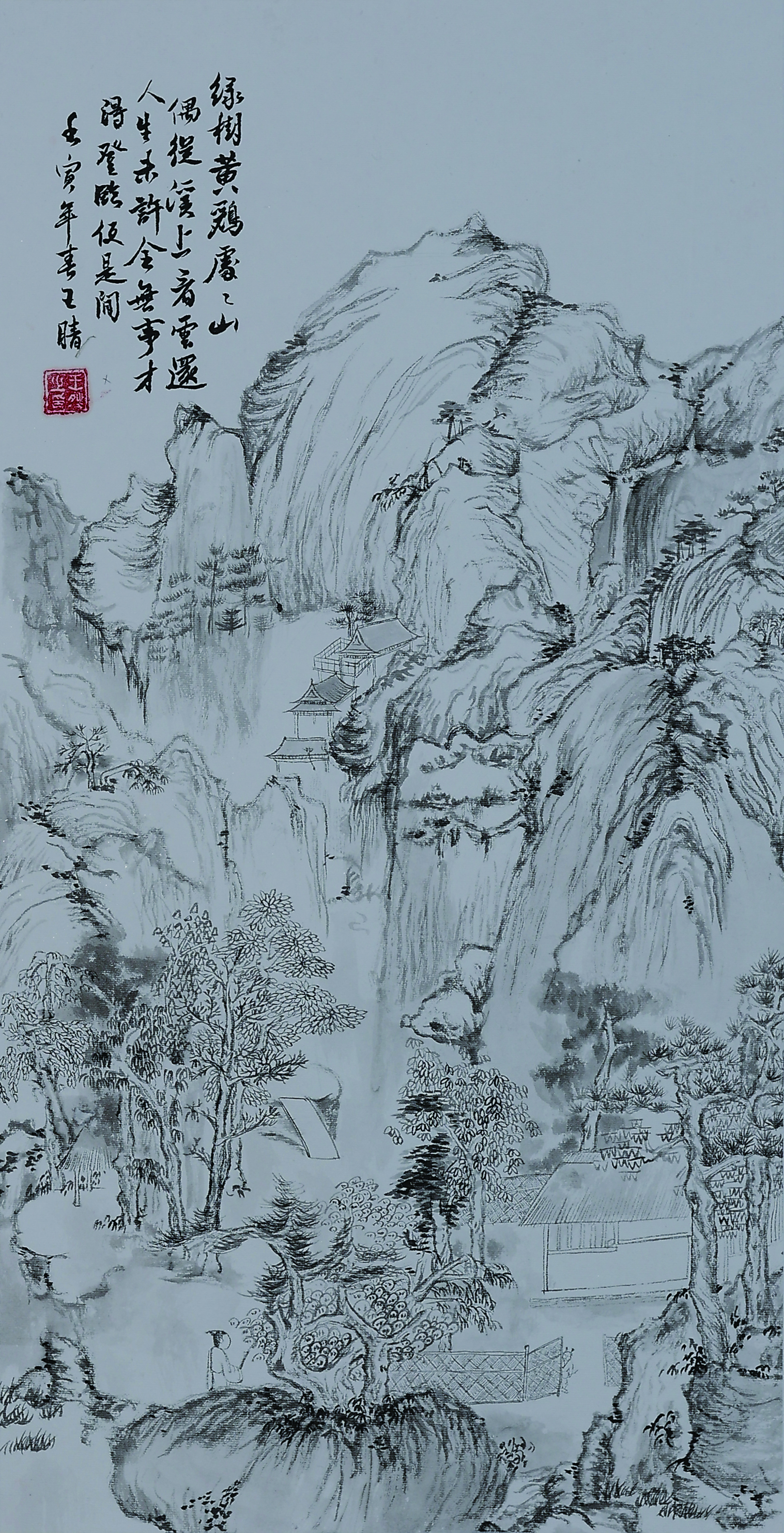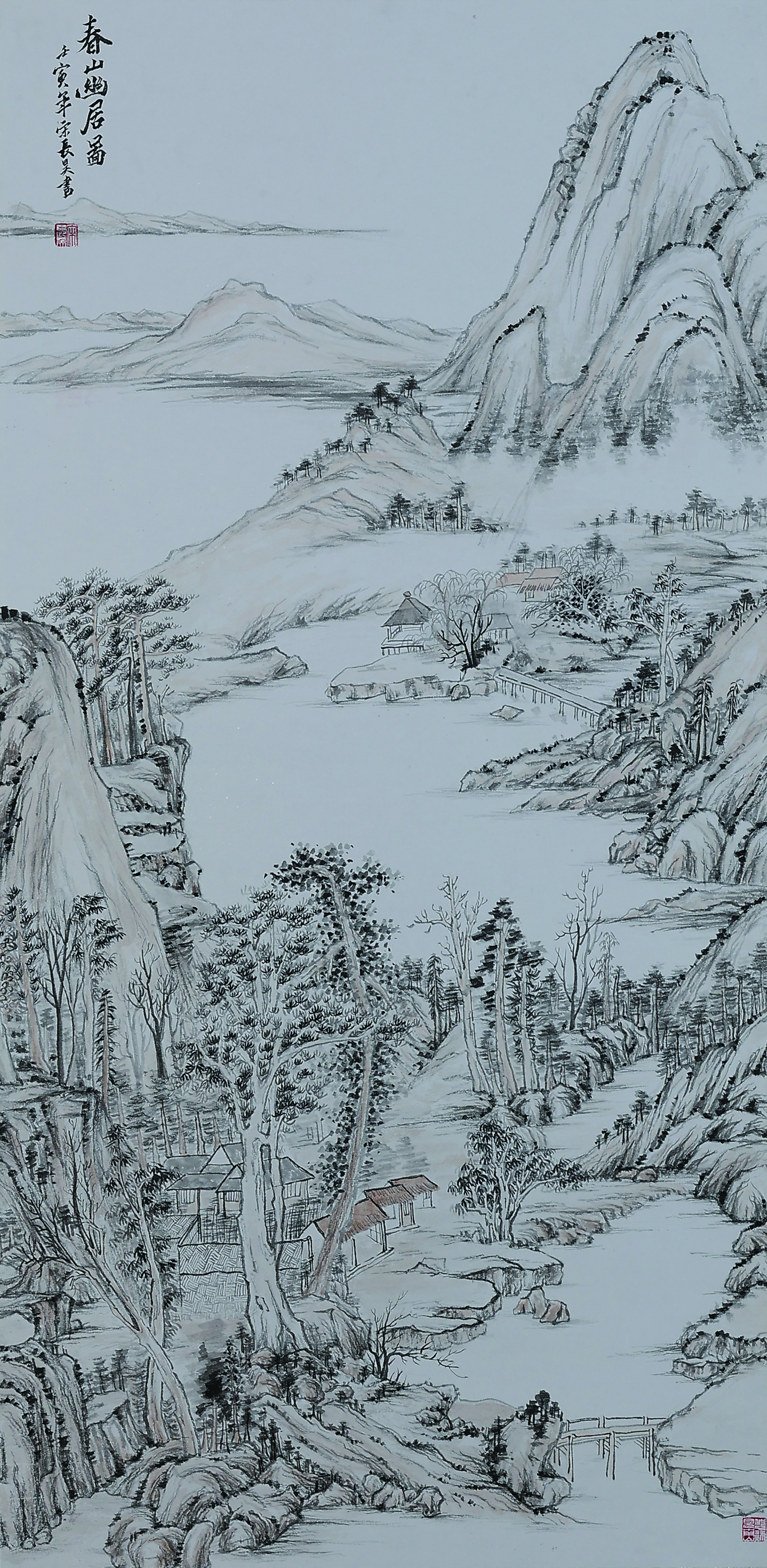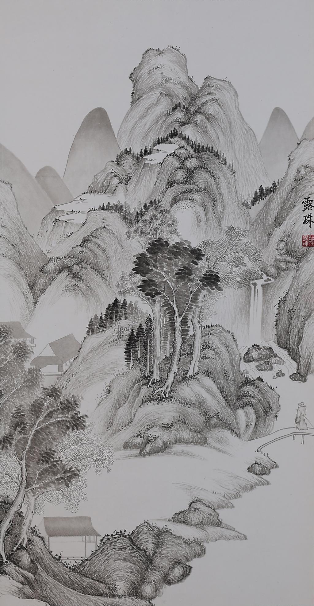 The peaks in the painting are all made and chapped by Peima Cun. Several trees and highly postured stones in the close-up and mid-range show the space in the painting, and the houses and characters increase the level changes of the painting. That’s why the work is named Dwelling in the Mountains.