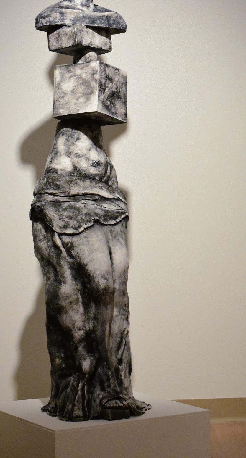 I was inspired by the flow of the universe and the curves of the body for this piece Voluminous shapesand curving lines merging together to create a form that at some angles resembles the human bodyThe organic shapes created also resemble clouds and remind me of the sky on a starry night .