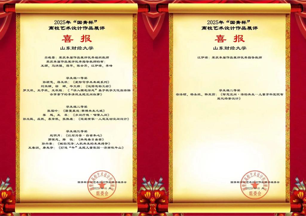 我院学子在比赛中成绩斐然。其中孙颖慧、蒋玉欣团队的《星际写字未来城系列》,刘效楠、徐娜、毕文婧团队的《涟漪造物工坊》,罗文欣、王子欣、王秋程团队的《“误入藕花深处”基于数字文化旅游融合背景下的李清照主题空间叙事》荣获一等奖;张福岭同学的《碧蔓星途:赛博共生之城》,姜越、王菲团队的《乡间疗境·喵懂人间》,孙立臣、庄凯、袁常凯、张振康团队的《宠爱有家--人宠互动空间设计》,宗洛颐、杨永姣、韩亚茹团队的《智愈空间·海韵共生--儿童牙科医院智能化场景设计》荣获二等奖;赵明月同学的《以石为鉴·自省本心》,郭家志、滕悦团队的《共赴春日盛宴》,孙兴泰同学的《械韵灵泽:人机共生的未来绮梦》,王春润、唐先宇团队的《打造“牛”主题儿童乐园--济南牧牛山》荣获三等奖。这些获奖作品构思新颖、制作精良,展现了香蕉视频