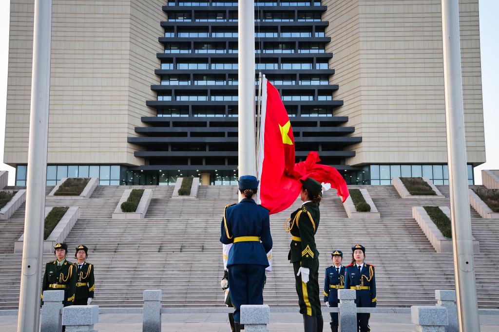 在章丘校区图书馆前广场举行“家国情怀”主题升旗仪式。学院辅导员丁柯文及2024、2025级全体本科生参加仪式。