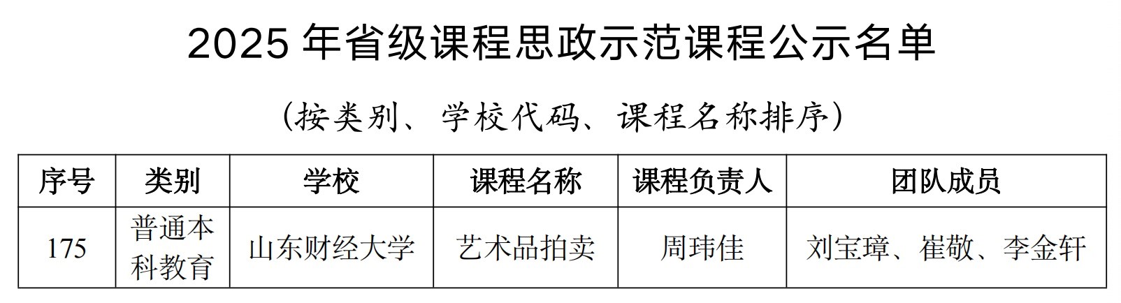 近日,山东省高等学校课程思政研究中心公布2025年省级课程思政示范课程(普通本科教育、研究生教育)名单认定结果,学院周玮佳老师主持的《艺术品拍卖》课程成功入选。