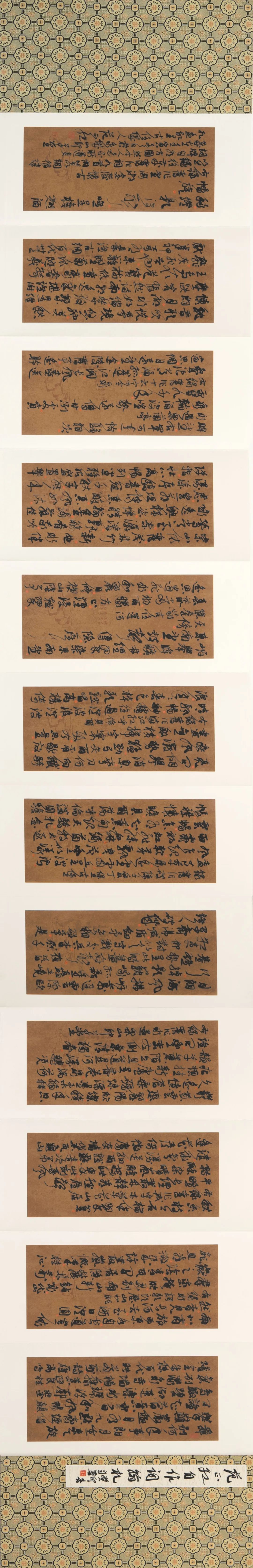 内容/知章骑马似乘船,眼花落井水底眠。汝阳三斗始朝天,道逢曲车口流涎,恨不移封向酒泉。左相日兴费万钱,饮如长鲸吸百川,衔杯乐圣称避贤。宗之潇洒美少年,举觞白眼望青天,皎如玉树临风前。苏晋长斋绣佛前,醉中往往爱逃禅。李白一斗诗百篇,长安市上酒家眠,天子呼来不上船,自称臣是酒中仙。张旭三杯草圣传,脱帽露顶王公前,挥毫落纸如云烟。焦遂五斗方卓然,高谈雄辩惊四筵。右录杜子美歌行《饮中八仙歌》,杜诗以沉郁为风范,而此诗则出其常规也。所述其时长安饮中八仙,酒中意态栩栩如生,可见诗圣之非凡处。有人称此为肖像诗,亦信然。以饮中八仙书之以草书,恰亦正相合于笔意者。